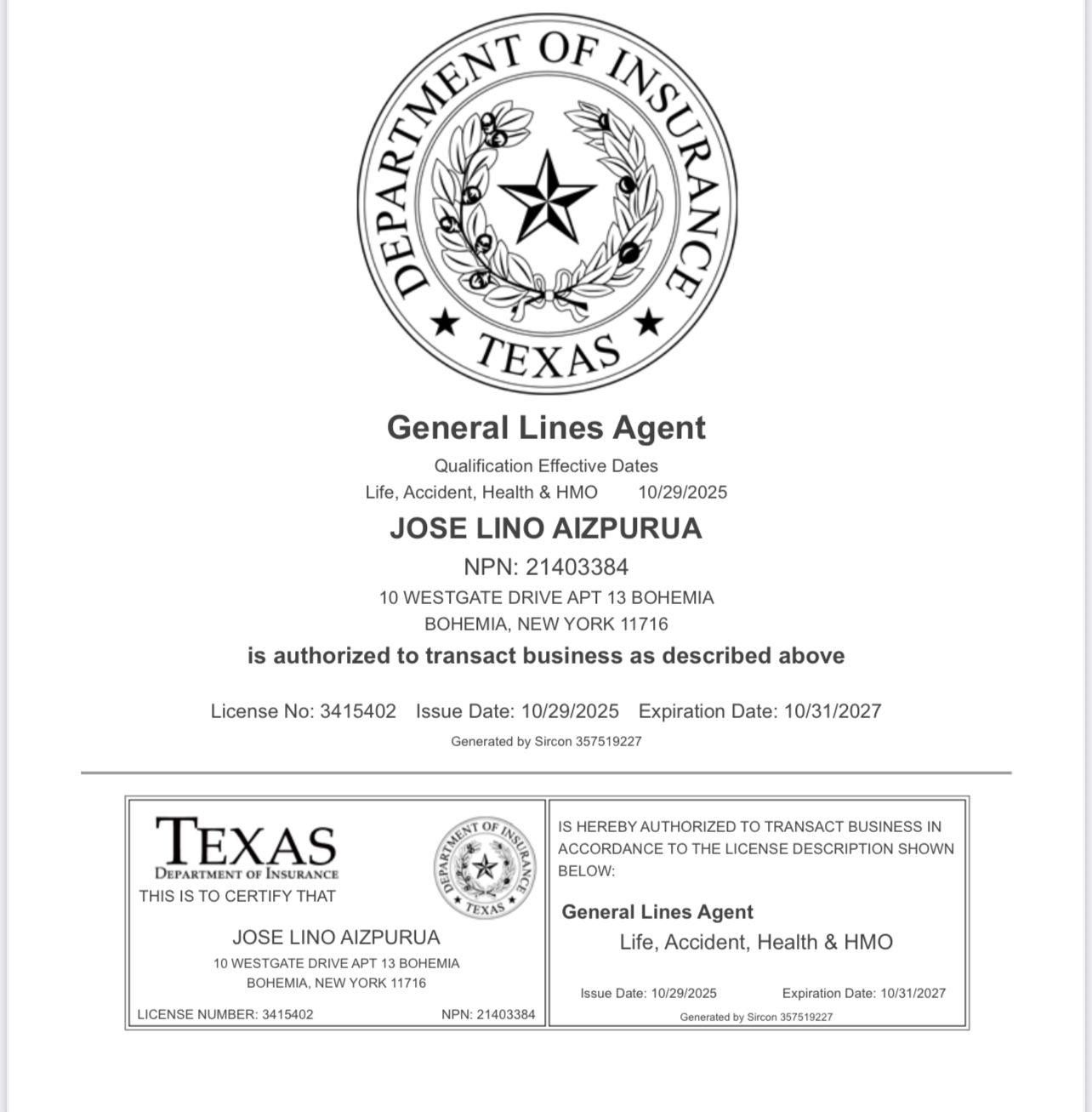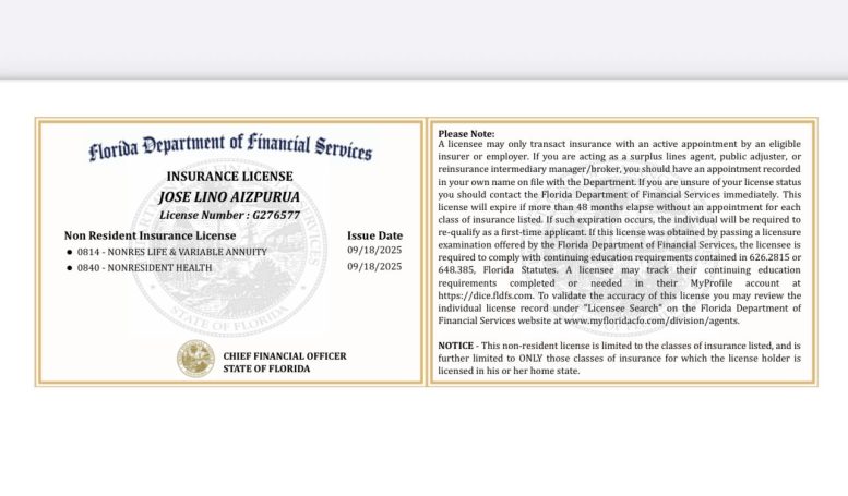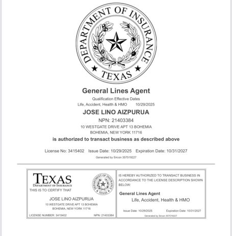 Agente licenciado en seguros de Vida, Salud y Accidentes en Estados Unidos.