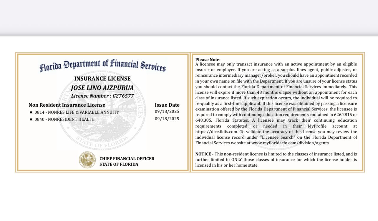 José Lino Aizpurua soy agente independiente especializado en soluciones de protección financiera para familias en Estados Unidos. Su enfoque es ayudar a cada cliente a encontrar una cobertura de seguro de vida que se adapte a su situación personal y a sus objetivos financieros.